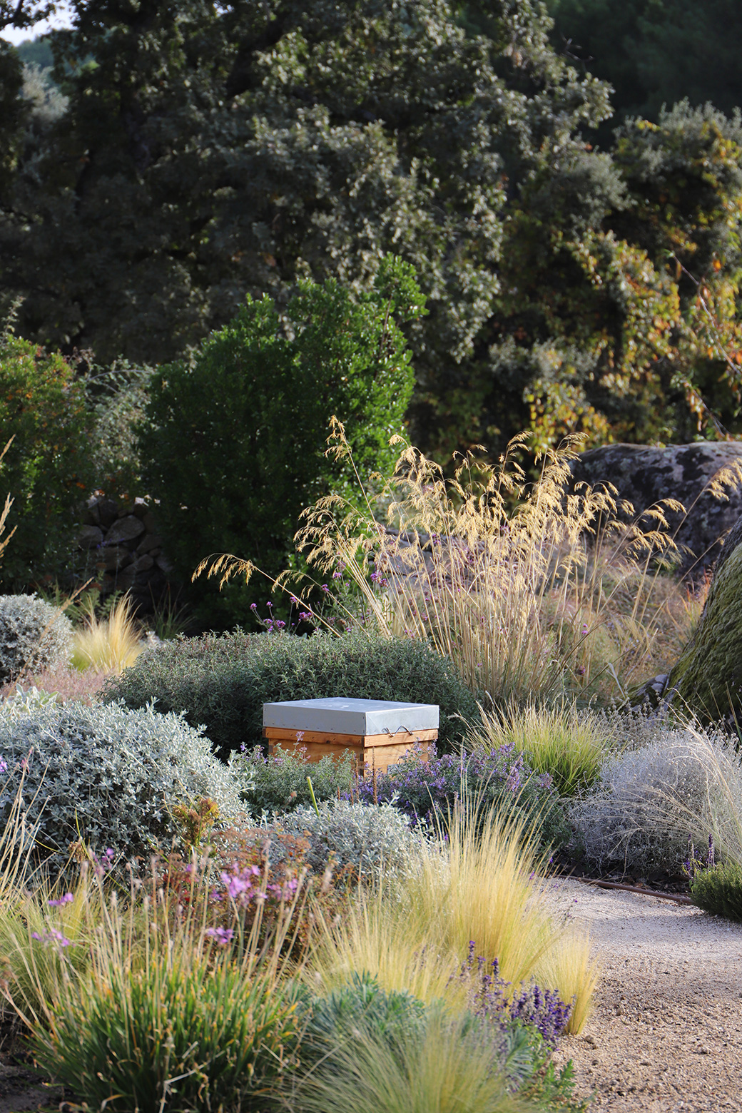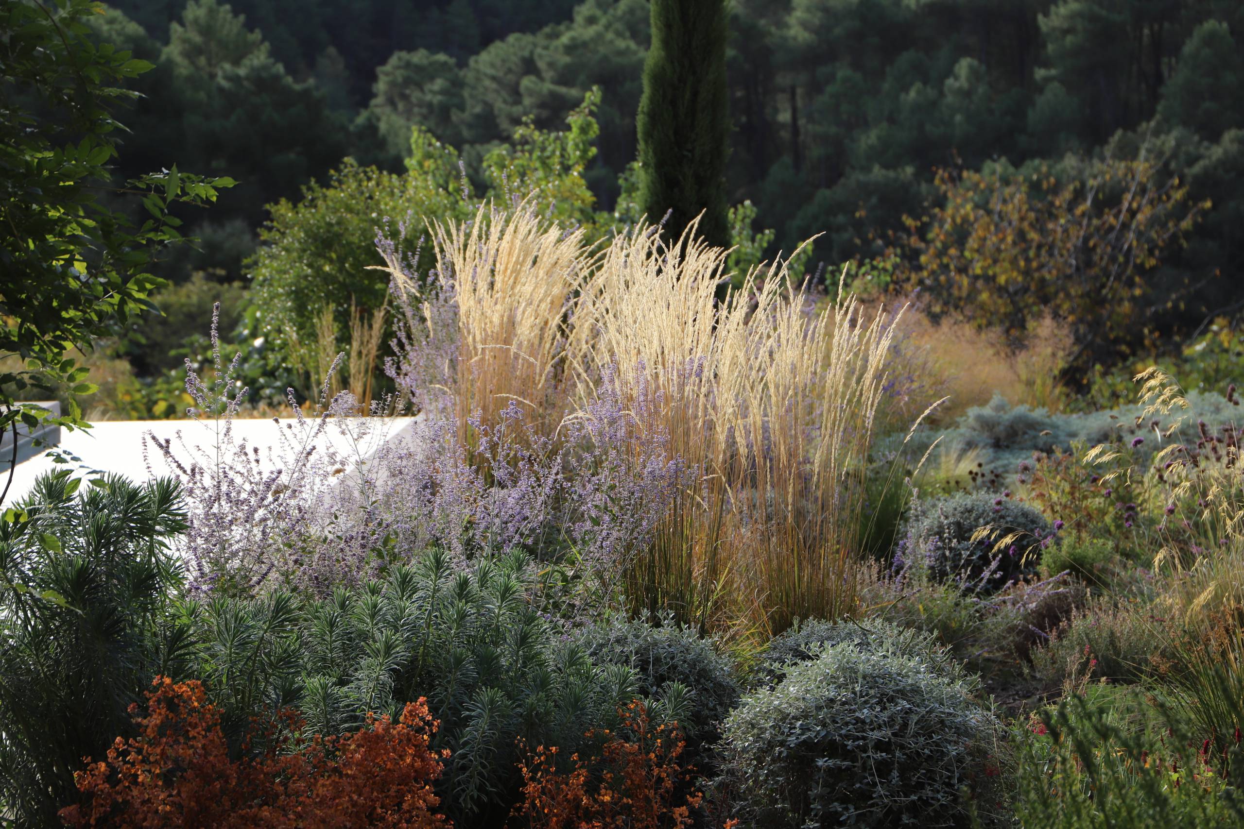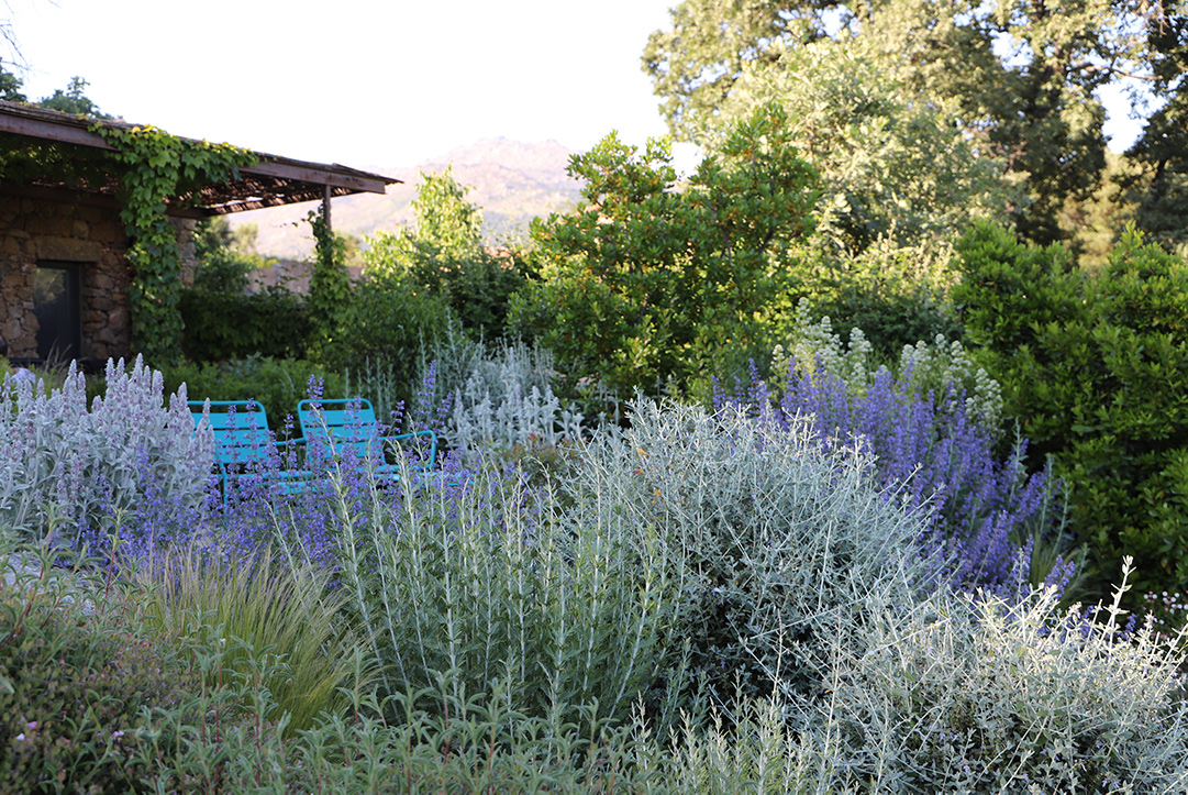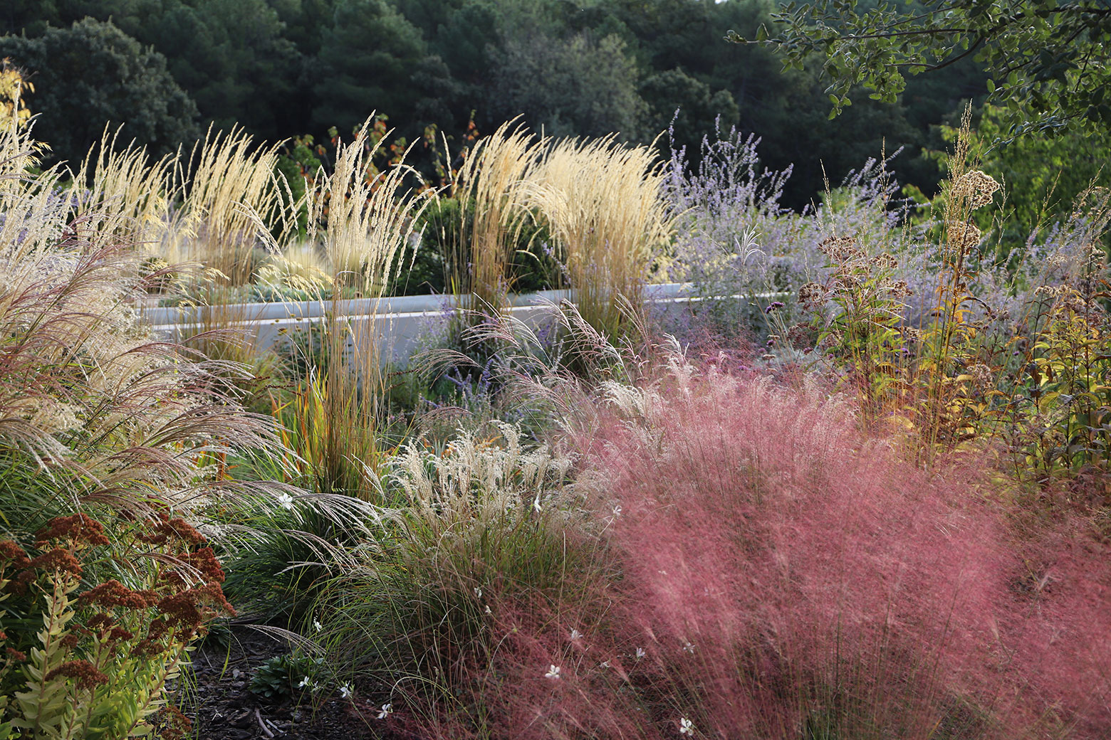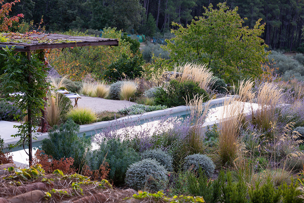 The low hummocky forms of Mediterranean shrubs are emphasised by occasional pruning, a practice which imitates the nibbling of goats characteristic of many local habitats. Pruning helps lengthen the lifespan of many species as well. Grasses are a highly effective contrast with them, in addition Álvaro noting that “they bring movement and different colours to the garden”. For the most part it is not native species he uses, but mostly of North American origin: Panicum vigatum ‘Heavy metal’ , which “I like to think is named for the movement that the seeds make with the wind which is like watching the equaliser of a heavy metal soundtrack”, Muhlenbergia capillaris with its vivid pink flower heads as well as that old favourite Calamagrostis x acutiflora ‘Karl foerster’ with its strongly vertical flower and seed heads.