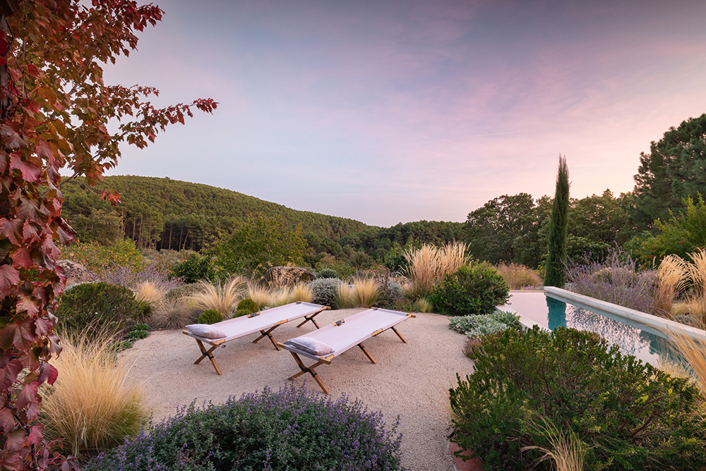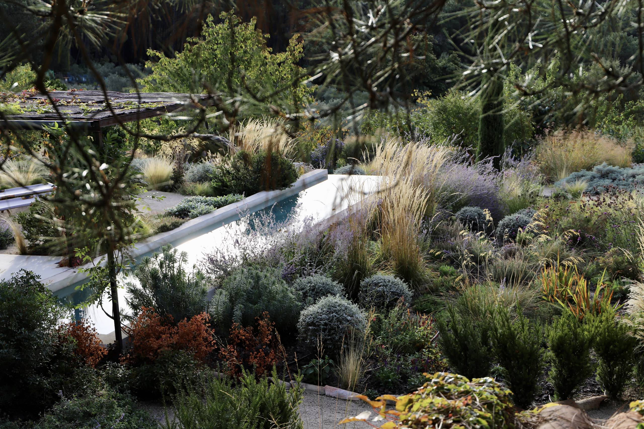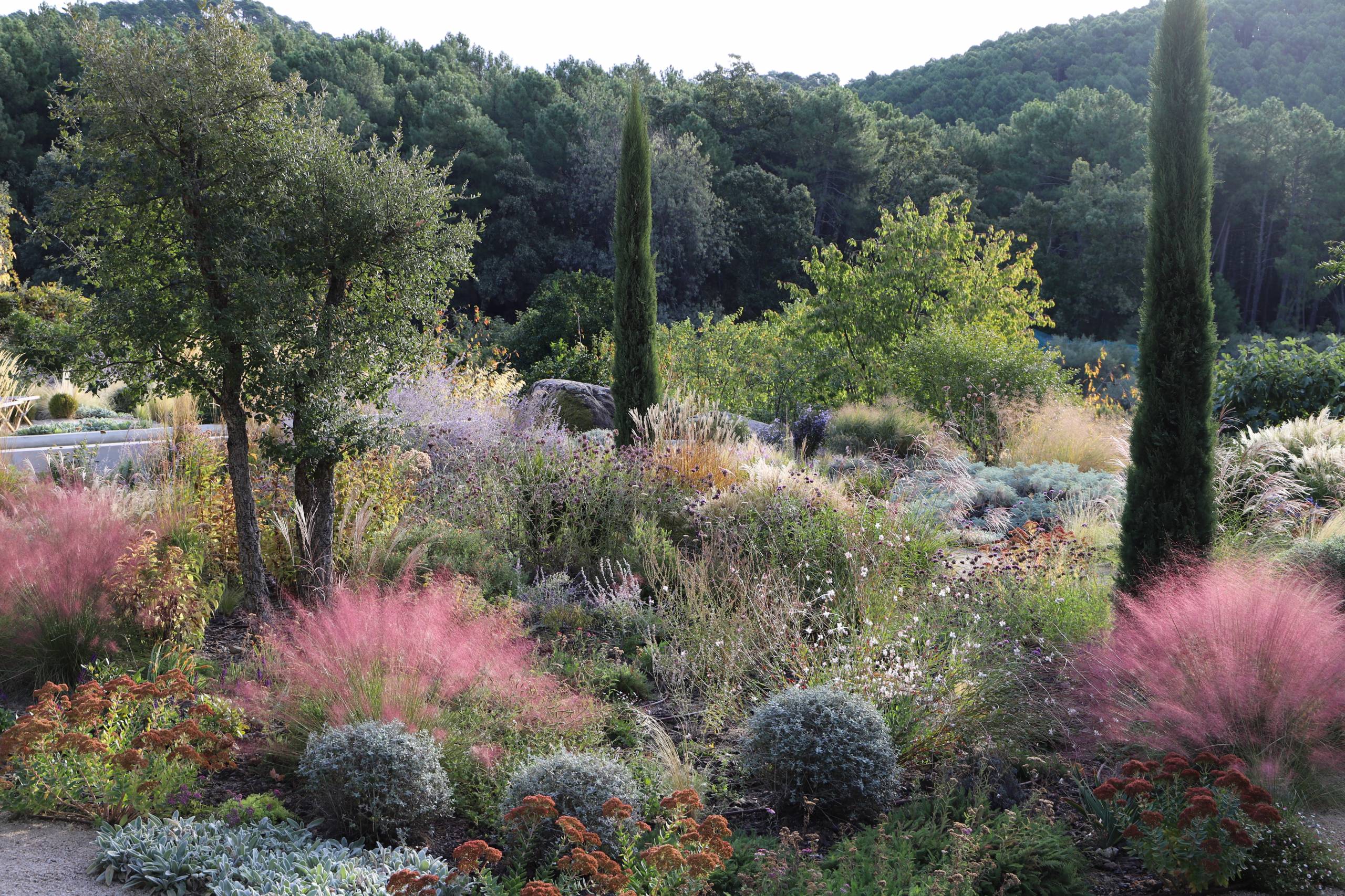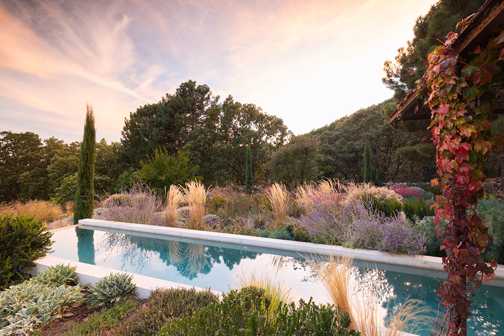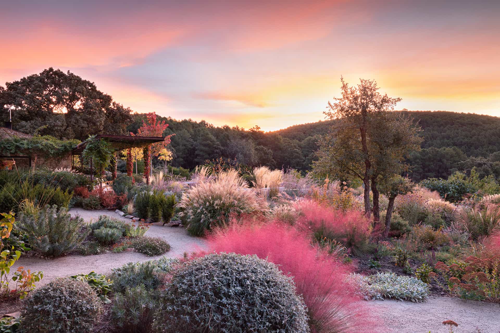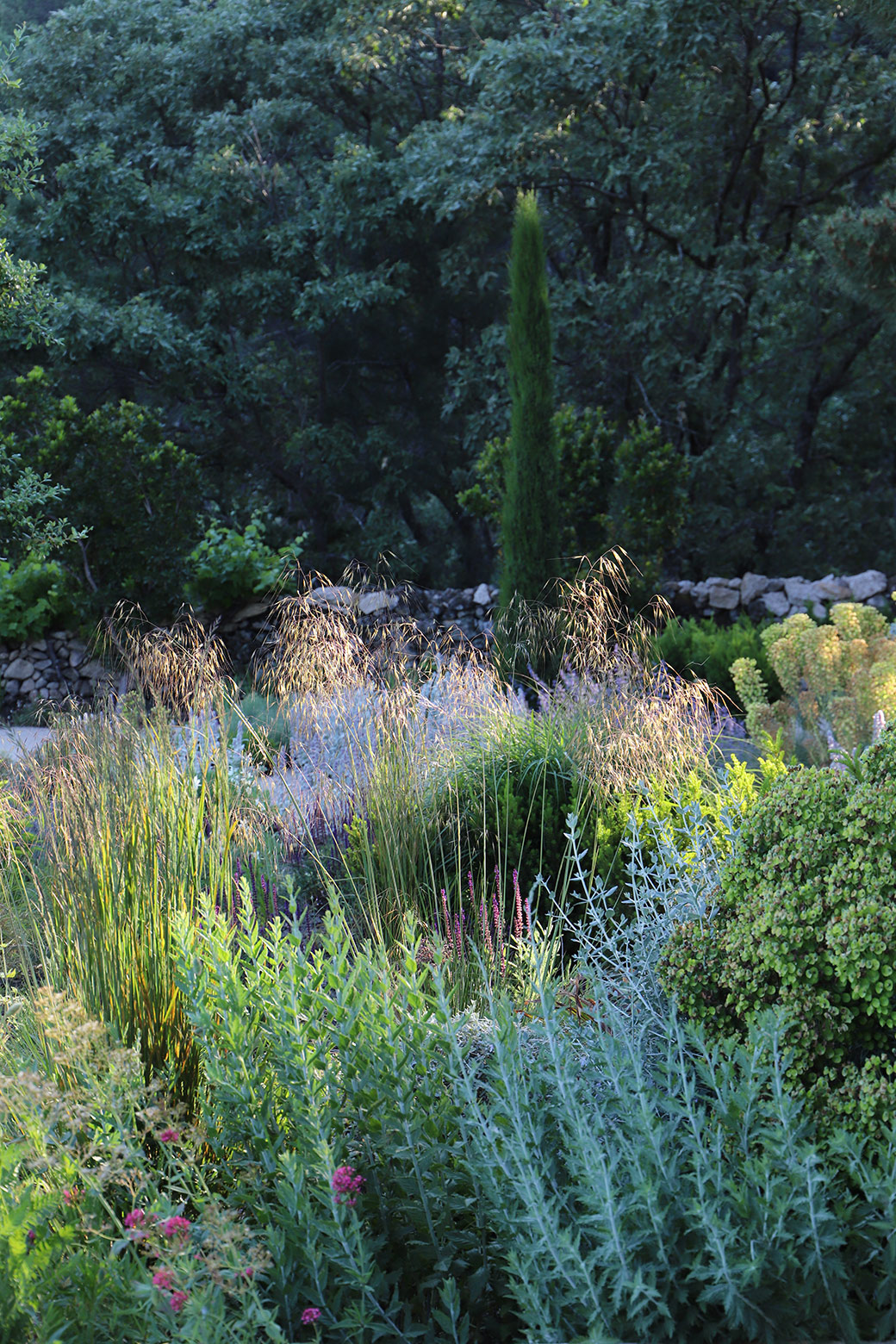 The low hummocky forms of Mediterranean shrubs are emphasised by occasional pruning, a practice which imitates the nibbling of goats characteristic of many local habitats. Pruning helps lengthen the lifespan of many species as well. Grasses are a highly effective contrast with them, in addition Álvaro noting that “they bring movement and different colours to the garden”. For the most part it is not native species he uses, but mostly of North American origin: Panicum vigatum ‘Heavy metal’ , which “I like to think is named for the movement that the seeds make with the wind which is like watching the equaliser of a heavy metal soundtrack”, Muhlenbergia capillaris with its vivid pink flower heads as well as that old favourite Calamagrostis x acutiflora ‘Karl foerster’ with its strongly vertical flower and seed heads.