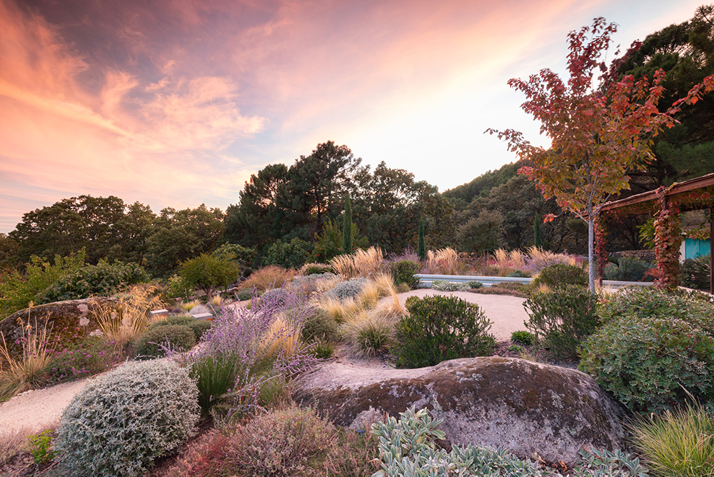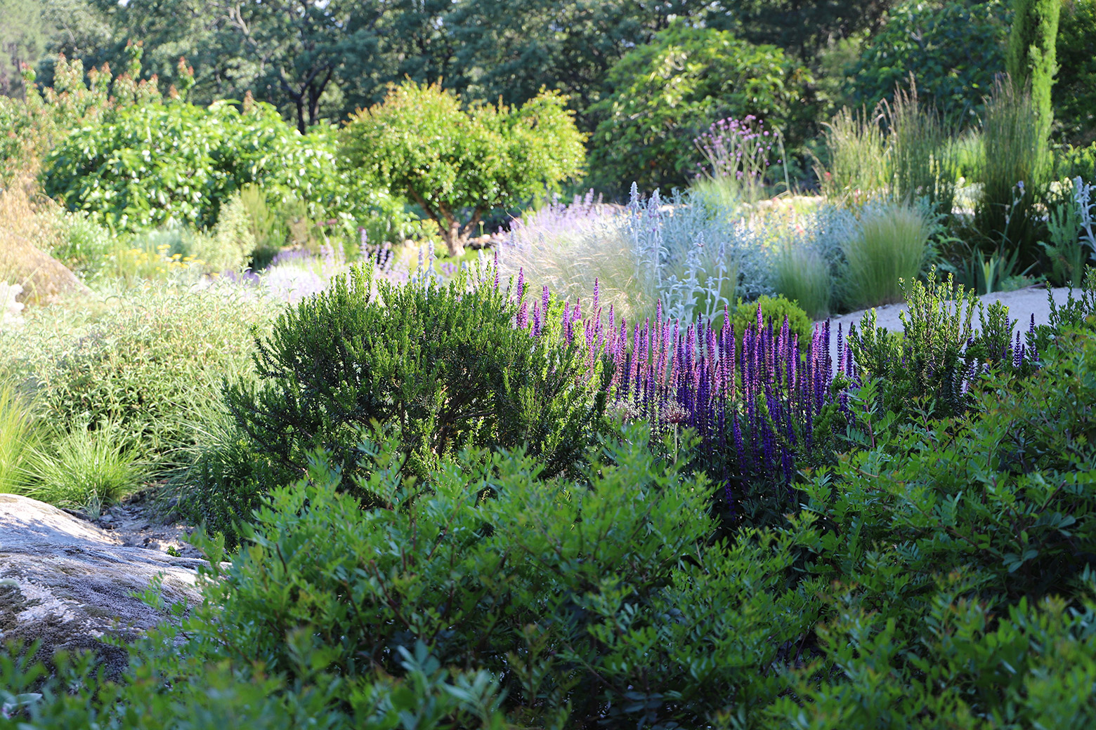 This garden demonstrates Álvaro’s design style, using mostly Iberian native species distributed in an informal and relaxed way. He describes it as being “planted in an ancient orchard with bad soil and too many rocks, we brought in good new soil and we moved some rocks around… basically there are seven circles of gravel (actually crushed granite) surrounded by planting of the plant species that I want to experiment before use them in my client´s gardens… how much irrigation they need, as well as mixing textures, colours and flowering times”. His intention is to make it a showroom of his work, to use it to illustrate talks about landscaping and to teach gardeners how to maintain this kind of perennial garden.